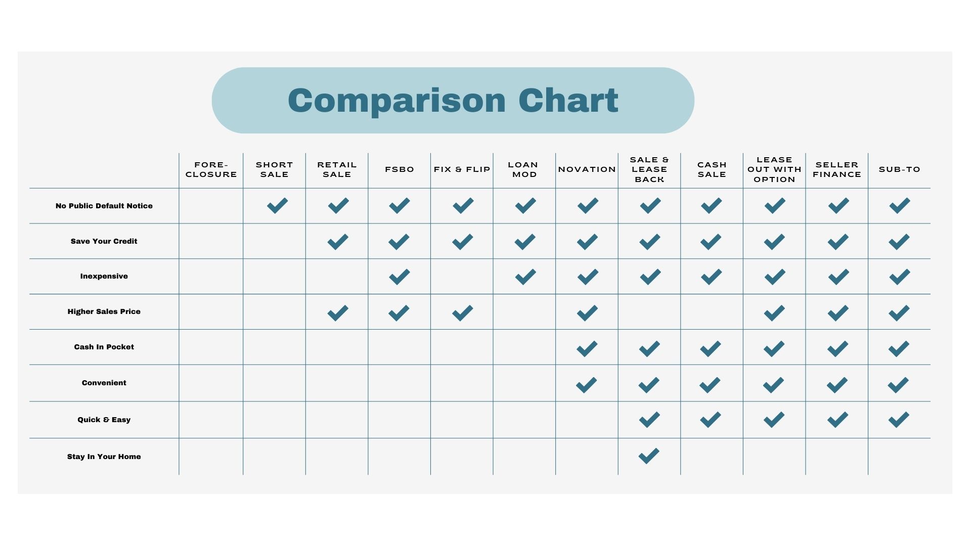 If you owe more on your home than what it’s currently worth, a short sale could be a way out. This means selling your home for less than what you owe, with your lender’s approval, to avoid foreclosure. We can help you find a buyer and walk you through the process of submitting the necessary paperwork—like tax returns and bank statements—to your lender. Short sales usually come into play after you’ve missed a couple of mortgage payments, and while you won’t walk away with cash in hand, you do get relief from the debt and avoid foreclosure. The sooner you start, the better your chances of a smooth process. Plus, we may even be able to help you find a new place to live. Just keep in mind that any forgiven debt might have tax implications, so it’s always a good idea to check with your attorney or CPA before moving forward.